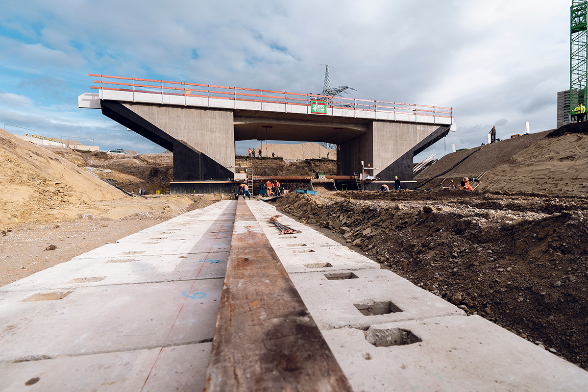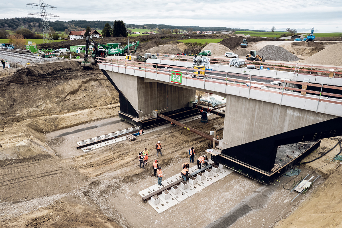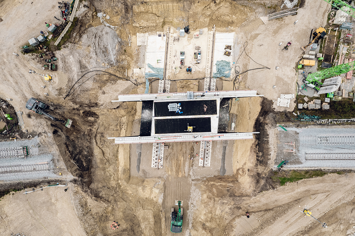 Zunächst wurde neben der bestehenden Eisenbahnstrecke eine neue Brücke gebaut. Breit genug für zwei Gleise und rund 1.600 Tonnen schwer. Nach Fertigstellung musste die Brücke um 25,5 Meter verschoben werden, um an die richtige Position zu gelangen. Tonnenschwere Millimeterarbeit und auch für die gestandenen Profis unseres Brückenbaus immer wieder ein Highlight. Denn erst beim Einschub zeigt sich endgültig, ob genau genug gearbeitet wurde – und das wurde es. In ca. 100 Stunden Sperrpause wurde die Brücke erfolgreich eingeschoben. Nicht nur für Bau-Fans ein filmreifes Erlebnis!