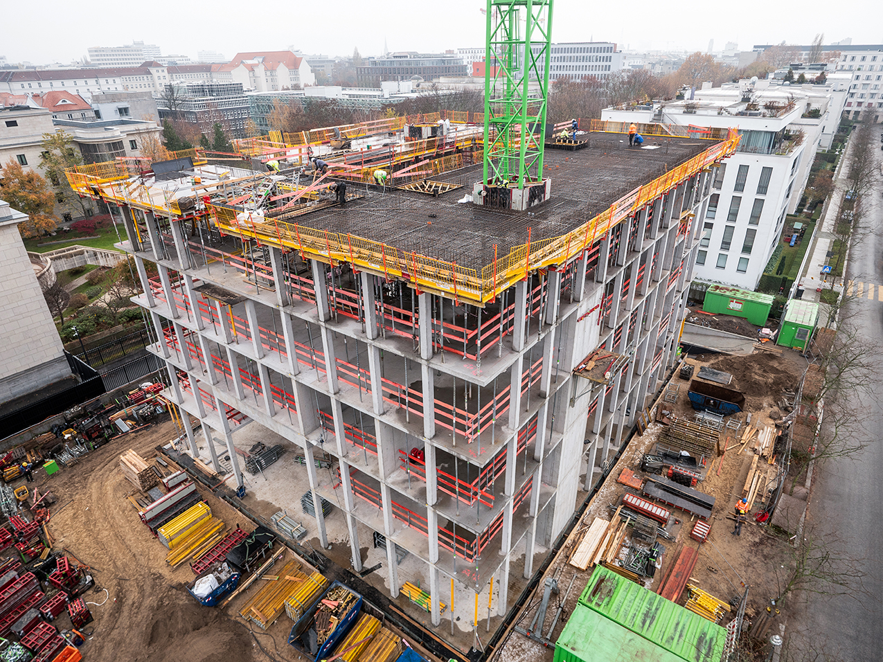 Verbaut wurden bis dahin 3.000 qm³ Beton als Stahlbetonskelettbau mit integriertem Stahlfachwerk in den Wänden, um eine höhere Deckenspannweite zu erreichen. Insgesamt besteht das Botschaftsgebäude aus fünf Vollgeschossen, einem UG sowie einem zusätzlichen Dachgeschoss für die technische Gebäudeausstattung. Aufgrund der vorherrschenden beengten Platzverhältnisse im Berliner Botschaftsviertel (angrenzend an den Berliner Tiergarten) waren und sind die Anforderungen an die Logistik hoch – konnten jedoch von unserem Bau-Team jederzeit gut gemeistert werden.